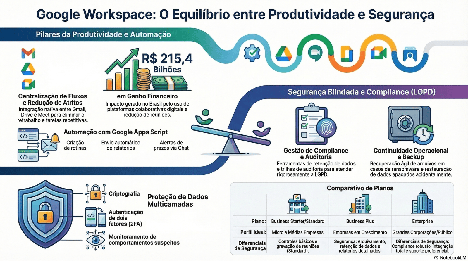 Empresas que buscam atender legislações como a LGPD precisam configurar políticas de retenção, permissões individualizadas e auditoria contínua sobre o uso dos dados. O Workspace ajuda nisso de várias formas: